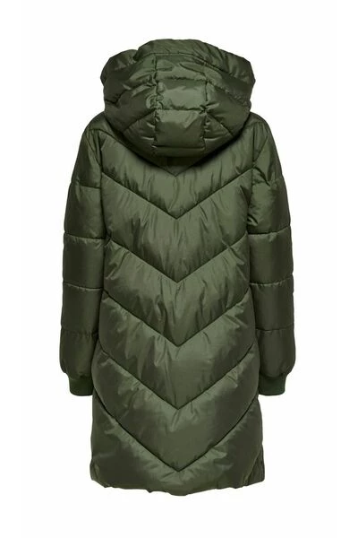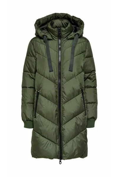 JDY lange gewatteerde jas. Effen kleur, capuchon met verstelbare touwtjes, rits aan de voorkant, 2 zijzakken met rits, lange mouwen met geribde zoom onderaan.