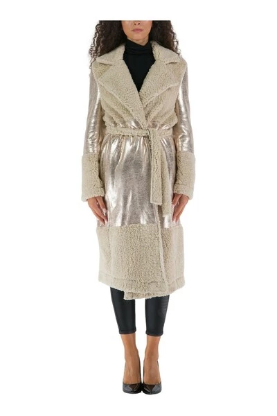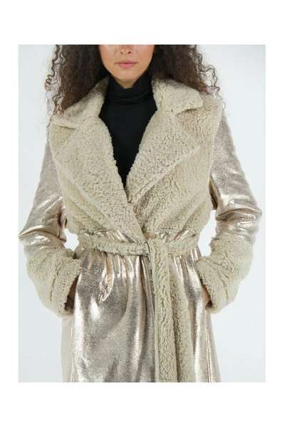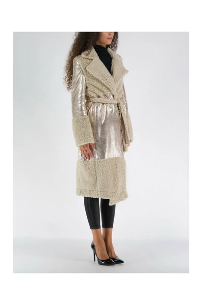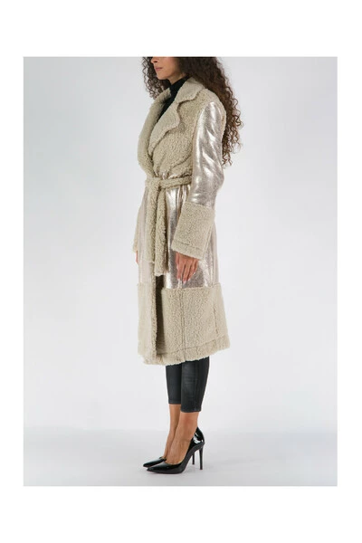Jijil damesjas. Onder-de-knie lang model, wikkelsluiting met ceintuur in de taille, kimono stijl. Voorzien van heldere gecoate stof details en korte effen bont.